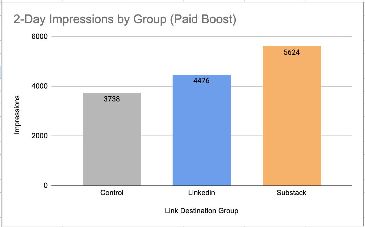 So, the LinkedIn group would outperform both the control group and the Substack group, generating more impressions at the aggregate level.