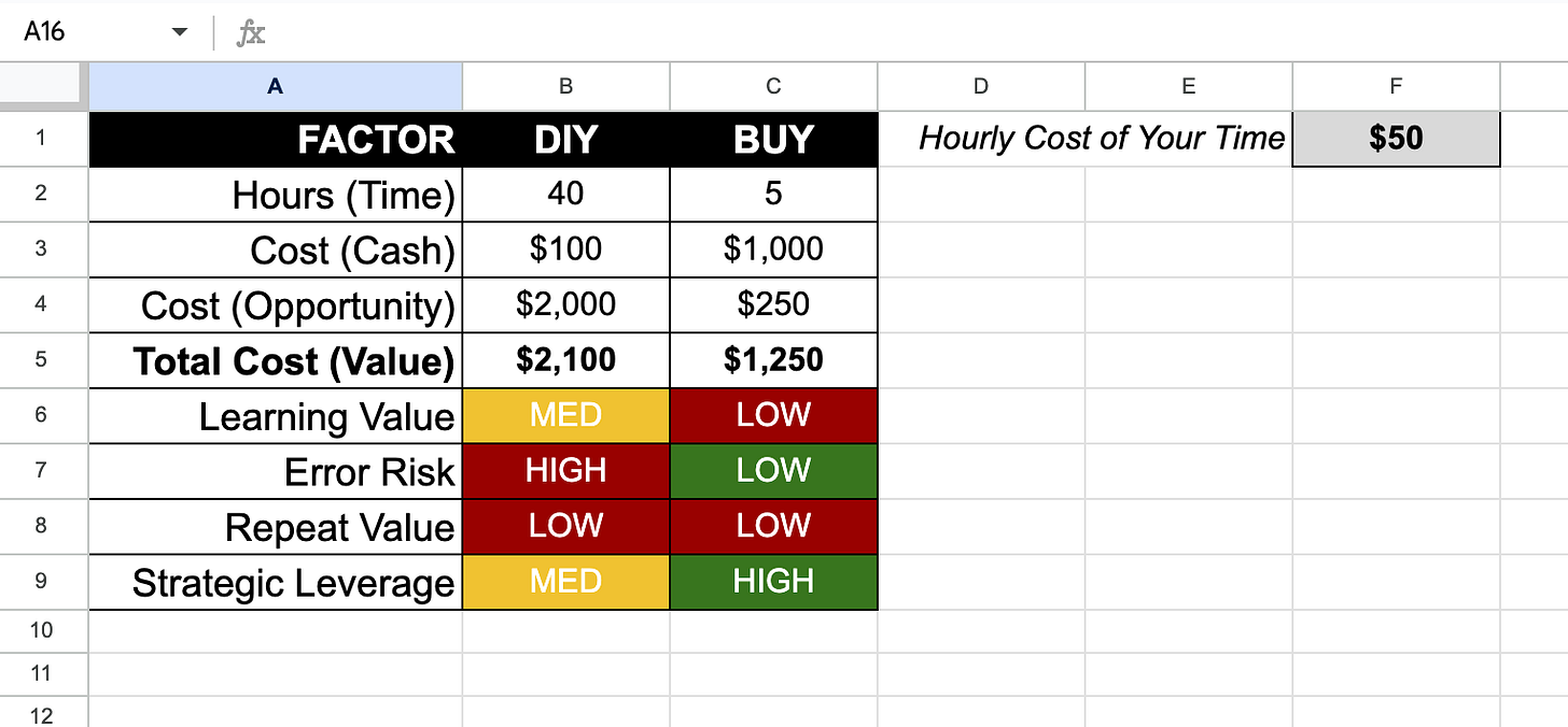 In the spreadsheet template above, look for lower total cost and more greens than reds. It’s a quick way of approximating the value delivered for buying vs DIY’ing.